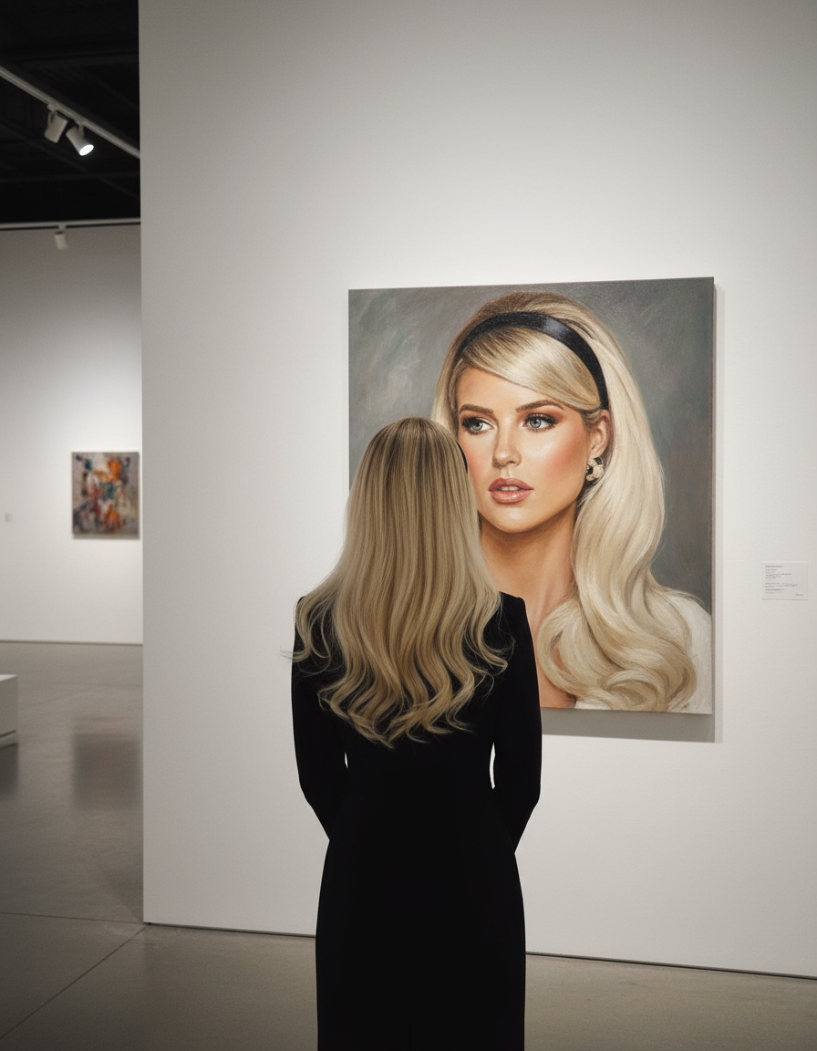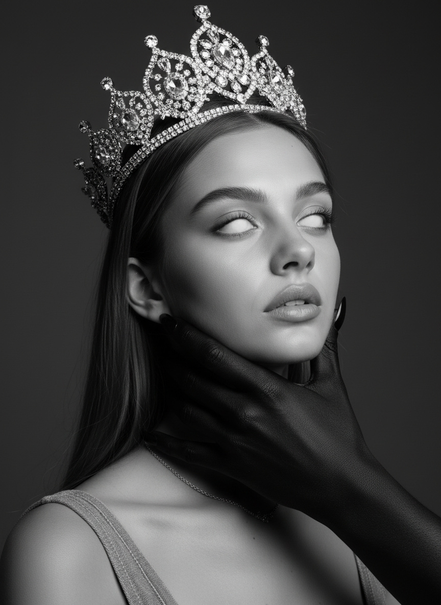 (Referring to the subject's main facial features in the image) Create a black-and-white female figure wearing a crown adorned with rhinestones and diamonds. Do not alter her facial features. Her eyes are completely white, and her face tilts slightly backward and upward, with her chin lifted high. A large, sharply defined male hand—painted entirely in deep black—grips her chin firmly. The hand exudes power, with broad, robust fingers and visible contours at the wrist, underscoring her strength. Long, sharp black nails further enhance the figure’s menacing, foreboding aura. The fingers curl around her chin, applying gentle yet deliberate pressure, evoking both control and an almost magnetic allure. The hand is unmistakably masculine, characterized by clean, precise lines. Its jet-black hue stands out dramatically against the stark backdrop, lending the scene an unsettling, otherworldly presence. Meanwhile, the woman gazes intently at the hand, her expression locked in a mesmerized, captivated stare. The crown features intricate rhinestone and diamond accents that barely catch the faint glimmer of light, adding just enough sparkle to contrast with the subdued, shadowy atmosphere. The background should remain monotonous, amplifying the interplay of refraction between the figure and its surroundings. Lighting should heighten the dramatic tension, emphasizing the stark contrast between light and shadow, thereby intensifying the eerie, spine-chilling mood of the composition.